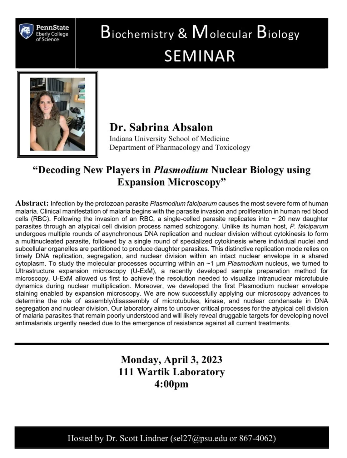 Excited and honored by the invitation to talk from Dr. Scott Lindner at the Biochemistry and Molecular Biology Seminar at Penn State.